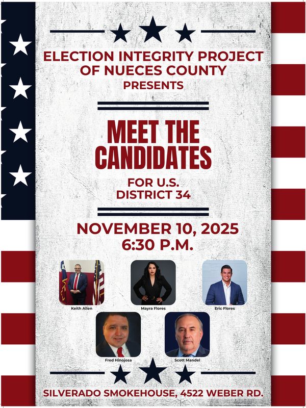 5 Candidates, Keith Allen; Scott Mandel; Fred Hinojosa; Eric Flores and Mayra Flores, running for the US House of Representatives District 34 will be here to share their views on Election Integrity Issues.